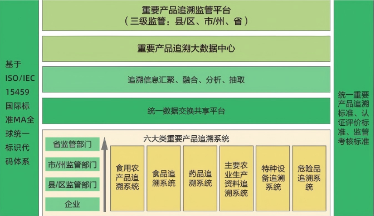 基于ISO/IEC 15459国际标准MA全球统一标识代码体系,制定统一重要产品追溯标准、认证评价标准和监管考核标准,建设六大类重要产品的县、市/州、省三级监管追溯体系,通过统一数据交换共享平台对各体系追溯数据进行汇聚、融合、分析、抽取,形成全省重要产品追溯大数据中心,各级政府及相关职能部门据此实现对各省重要产品篇追溯业务的监管。